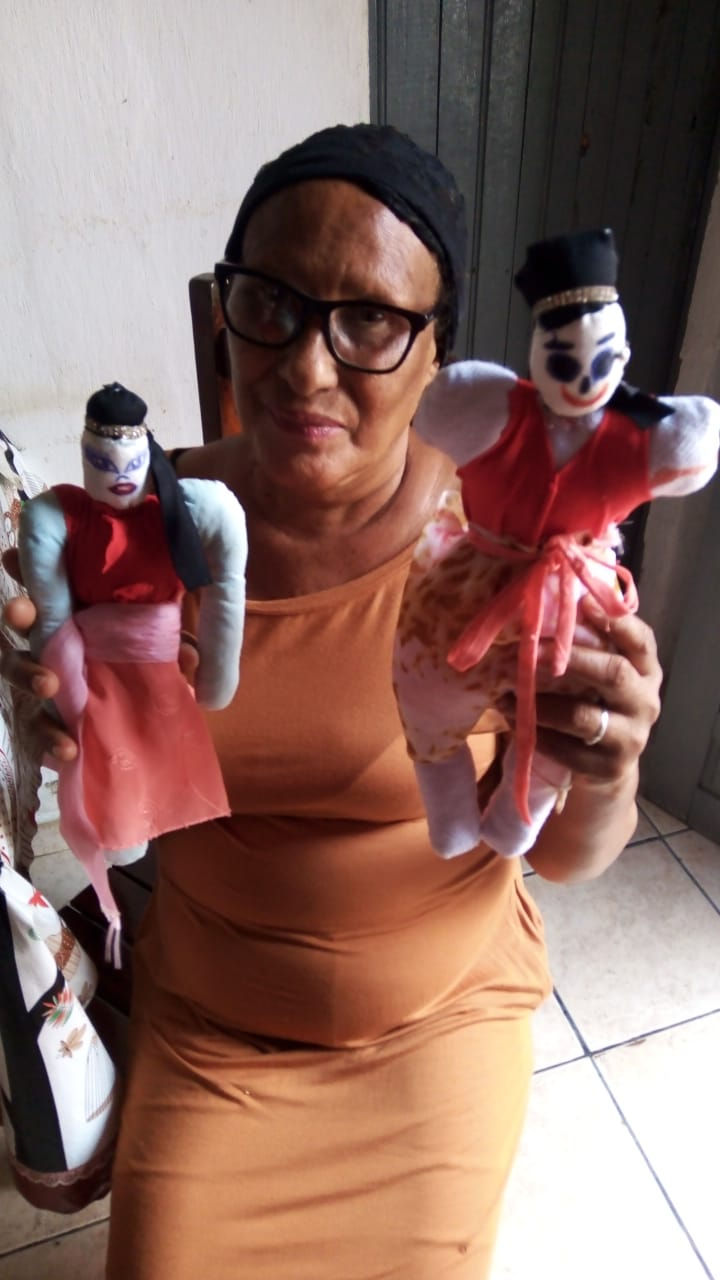 Maria Madalena aprendeu a fazer as bonecas de pano com as filhas de sua madrinha quando tinha 15 anos. Certa ocasião, quando já era mãe, estava confeccionando uma para sua filha Rai e ri muito quando lembra desse dia.